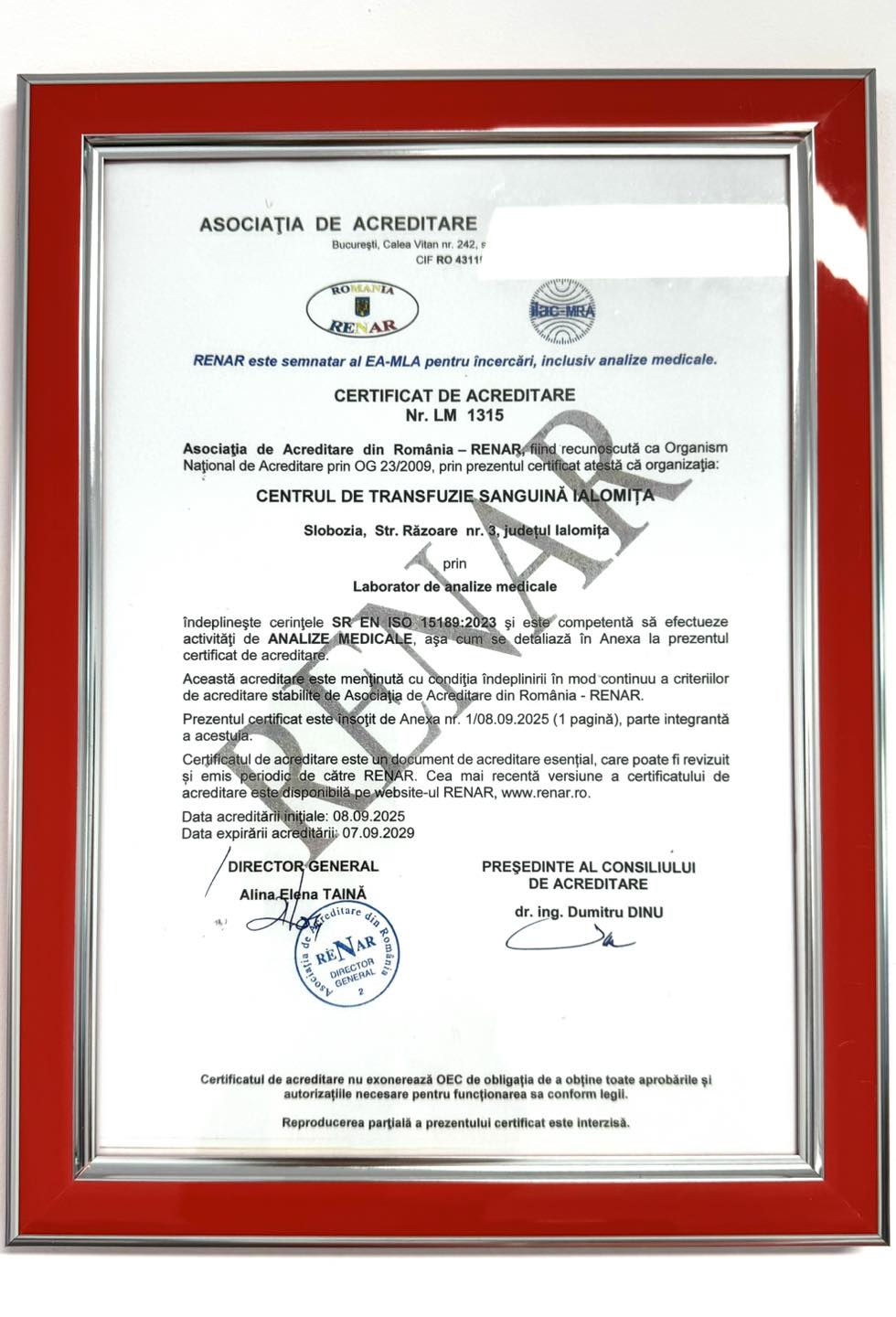 Centrul de Transfuzie Sanguină din Ialomița, acreditat RENAR ca singurul laborator certificat din țară