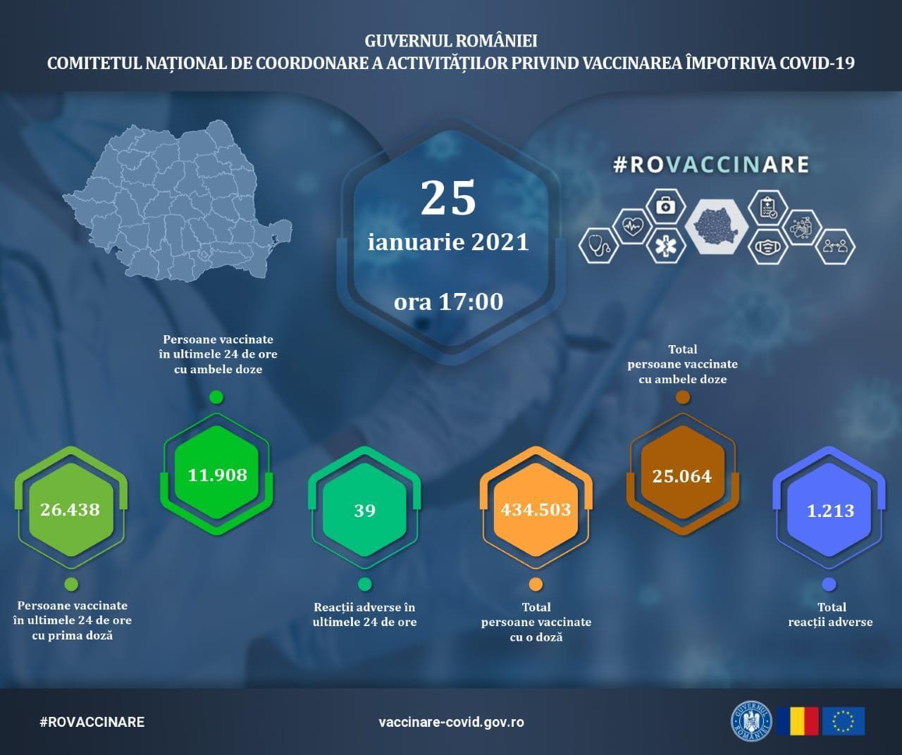 Astfel, număr total de doze administrate de vaccin împotriva COVID-19 Pfizer BioNTech, începând cu data de 27 decembrie, este de 484.631, la un număr de 459.567 persoane din care 434.503 persoane vaccinate cu prima doză, iar 25.064 persoane vaccinate cu a doua doză.