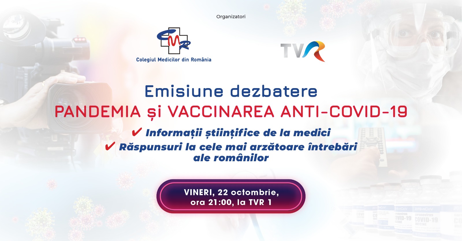 Colegiul Medicilor din România (CMR) şi Televiziunea Română organizează, vineri, de la ora 21.00, o dezbatere pe tema vaccinării anti-COVID-19 și importanța înțelegerii corecte la nivelul opiniei publice a informațiilor legate de pandemia de COVID-19.