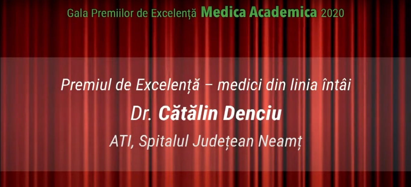 Medicul Cătălin Denciu, rănit grav în incendiul izbucnit în data de 14 noiembrie, la secția de ATI a Spitalului Județean Piatra Neamț, a fost premiat la Gala Premiilor de Excelență ”Medica Academica” 2020, eveniment desfășurat exclusiv online. Doctorului i s-a acordat ”Premiul de Excelență Medica Academica – medici din linia întâi”.