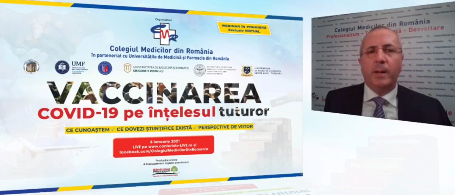 Colegiul Medicilor din România, sub egida universităților de medicină și farmacie din România, organizează vineri, conferința online „Vaccinarea COVID-19 pe înțelesul tuturor”, producția video a webinarului fiind asigurată de Sănătatea Press Group.