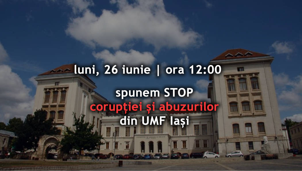 Studenții UMF Iași, susținuți de Liga Studenților (LS IAȘI), au protestat luni, 26 iunie, de la ora 12.00, pe esplanada din fața universității „împotriva corupției și ineficienței din sistemul de învățământ medical”, „împotriva deciziilor recente ale conducerii de majorare a taxelor de cazare și școlarizare, de impunere a prezenței obligatorii la cursuri în contextul în care majoritatea profesorilor citesc din prezentări, bibliografiile și materialele sunt învechite iar rezultatele evaluării cadrelor didactice de către studenți nu sunt luate în considerație”; tododată, tinerii protestează și împotriva metodelor haotice și discriminatorii de examinare a studenților, precum și față de lipsa de transparență și consultare în procesele decizionale. O listă completă a revendicărilor, sub forma unui memoriu, va fi publicată luni și înaintată conducerii instituției” – se menționează pe site-ul Ligii Studenților.