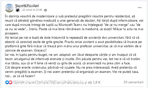 „Românii nu știu ce înseamă să fii student la medicină și bătaia de joc pe care o suferă tinerii timp de 6 ani ca să ajungă la rezidențiat ca după să îndure încă câțiva ani acest sistem mizerabil. Sistemul de sănătate din UMF-uri se împute, iar de acest adevăr fug toți cei care vor să dea frumos la televizor și în presă, să arate ce politicieni preocupați sunt ei și ce „mari” profesori sunt.