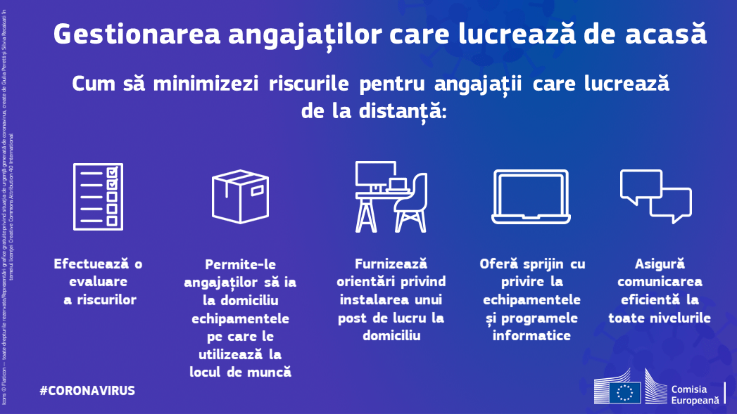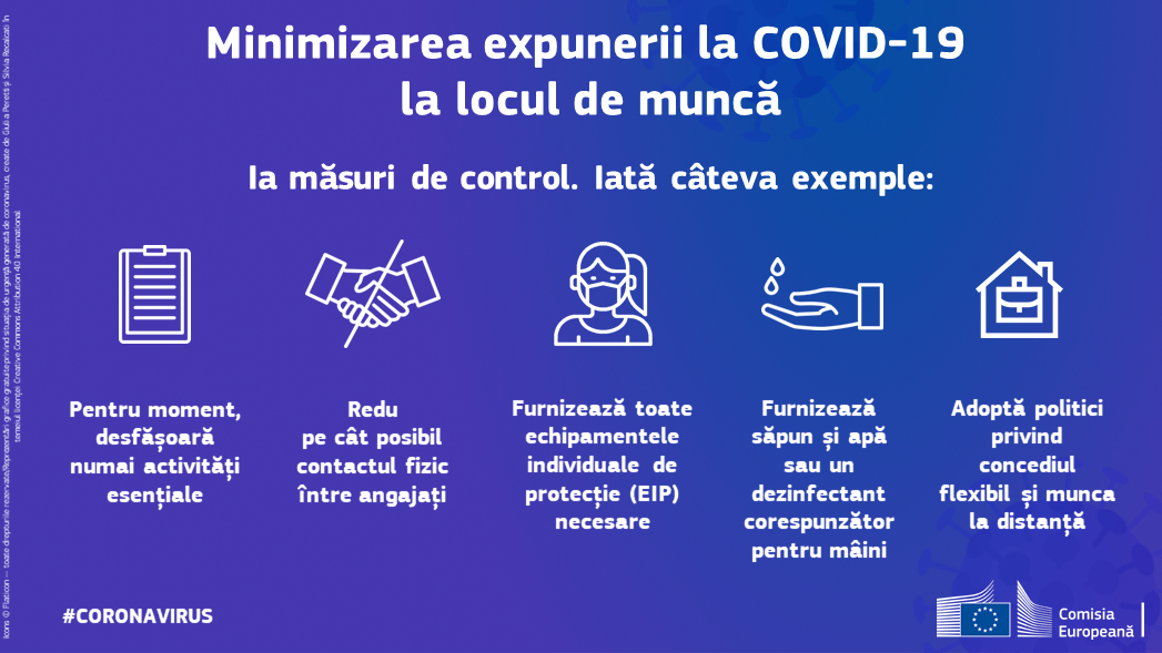 Astfel, pentru minimizarea expunerii la COVID-19 la locul de muncă, angajatorii sunt sfătuiți ca pentru moment să desfășoare numai activități esențiale, să reducă pe cât posibil contactul între angajați și să furnizeze toate echipamentele individuale de protecție necesare.