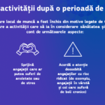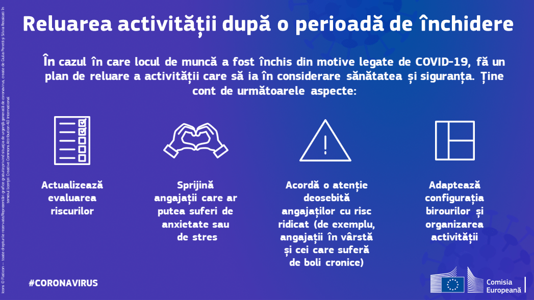 În cazul în care locul de muncă a fost închid din motive legate de COVID, angajatorii sunt sfătuiți să facă un plan de reluare a activității care să ia în considerare sănătatea și siguranța, ținând cont de câteva aspecte. Acestea sunt: actualizarea evaluării riscurilor, sprijinirea angajaților care ar putea suferi de anxietate sau stres, acordarea unei atenții deosebite angajaților cu risc ridicat, precum cei în vârstă sau care suferă de boli cronice și adaptarea configurației birourilor și organizarea activității.