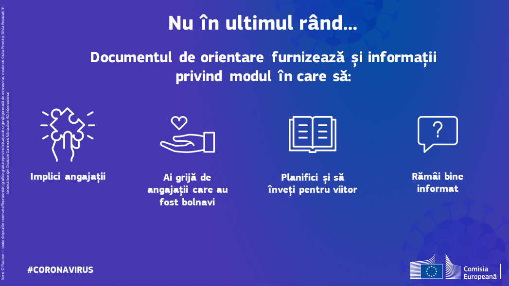 Agenția Europeană pentru Securitate și Sănătate în Muncă (EU-OSHA) a publicat, recent, un ghid privind întoarcerea la serviciu, care prezintă orientări cu privire la garantarea sănătății și siguranței lucrătorilor. Ghidul răspunde la întrebările care îi preocupă pe mulți angajatori în acest moment în care țările UE planifică sau realizează întoarcerea treptată la locul de muncă după coronavirus.