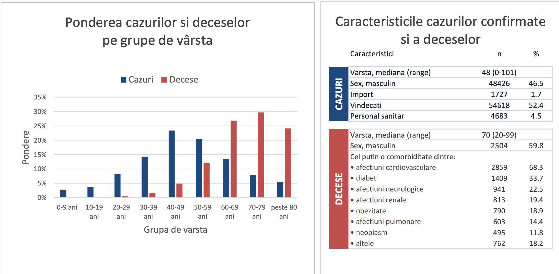 O proporție de 59,8% dintre decese au fost înregistrate în rândul persoanelor de sex masculin (2.504 persoane). O mare parte dintre persoanele decedate (95%) avea cel puţin o comorbiditate: afecţiuni cardiovasculare (68,3%), diabet (33,7%), afecţiuni neurologice (22,5%), afecţiuni renale (19,4%), obezitate (18,9%), afecţiuni pulmonare (14,4%), neoplasm (11,8%), altele (18,2%), relevă Raportul CNSCBT.