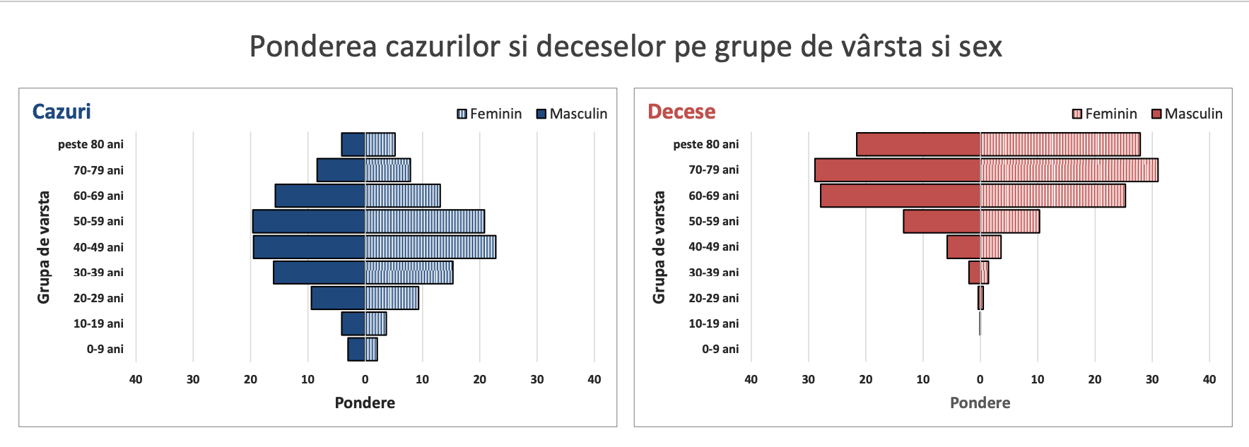 Referitor la ponderea deceselor pe grupe de vârstă şi sex, cele mai multe decese la femei erau asociate, până la data amintită, cu grupele de vârstă 70-79 ani (cca 31%), peste 80 de ani (aproximativ 28%) şi 60-69 ani (aproximativ 26%). La bărbaţi, categoriile de vârstă cele mai afectate de decese erau 70-79 de ani (cca 29%) şi 60-69 ani (cca 28%); grupa de vârstă peste 80 de ani era afectată în proporţie de aproximativ 22%, până la 13 septembrie 2020, conform www.cnscbt.ro.